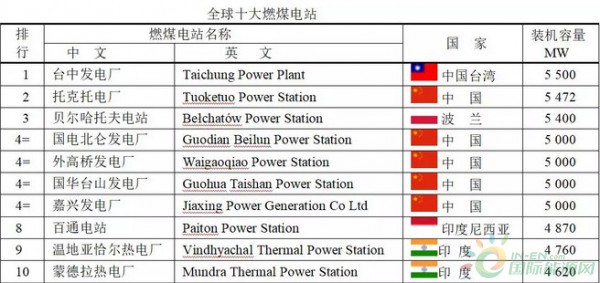 世界上最大的燃煤電站是臺中發(fā)電廠(Taichung Power Plant),位于中國臺灣臺中市龍井區(qū),臺中發(fā)電廠裝機容量為5500MW,也是世界上二氧化碳排放最多的發(fā)電廠,年排放約4000萬噸CO2,相當(dāng)于整個瑞士的年排放量。臺中發(fā)電廠結(jié)合燃?xì)獍l(fā)電和風(fēng)力發(fā)電,工廠總裝機容量可達5824MW。