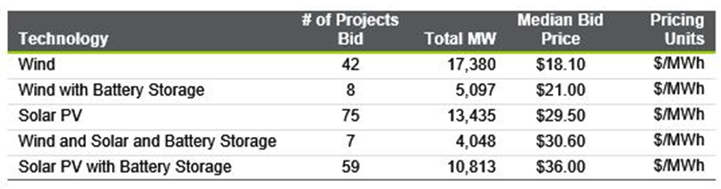 科羅拉多州儲能市場最值得關注的發(fā)展是來自該州最大的電力供應商Xcel Energy公司日前公布的項目,該公司實施了新的太陽能、風能和儲能容量的投標。通過全方位的招標,Xcel公司收到了一些項目的投標報價,這些項目提供了風電、風能+電池儲能、太陽能、太陽能+電池儲能,以及三種資源結合在一個項目中的最低價格。下表顯示了總出價和收到的平均價格。