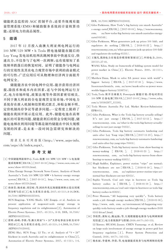 投入南澳大利亞州電網(wǎng)運(yùn)行的100MW/129MW·h的特斯拉鋰電池儲能在Loy Yang發(fā)電站機(jī)組兩次跳閘事故中快速反應(yīng)、快速出力,不僅參與了電網(wǎng)一次調(diào)頻,也有效縮短了系統(tǒng)頻率跌落后的恢復(fù)時(shí)間,證明了儲能參與電網(wǎng)運(yùn)行的實(shí)效性及其在電力現(xiàn)貨市場中獲利的商業(yè)模式的可行性