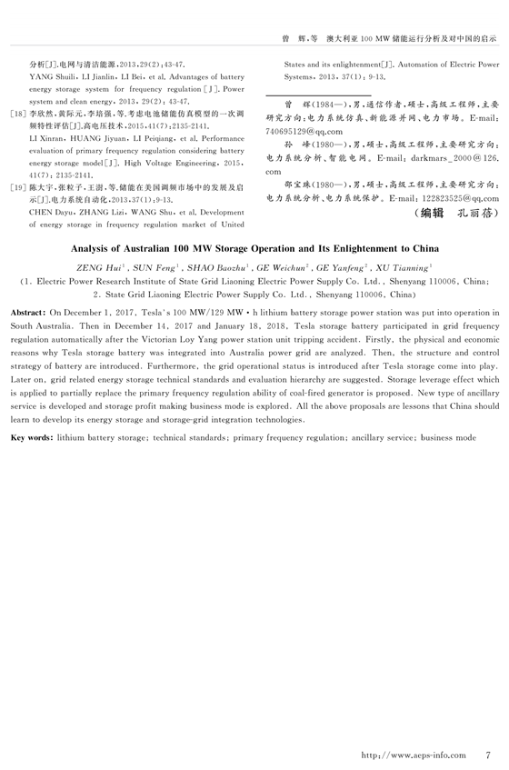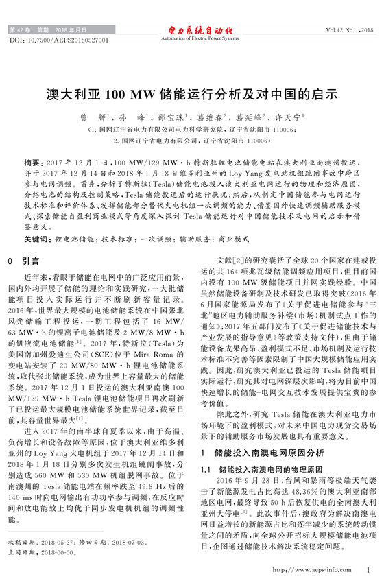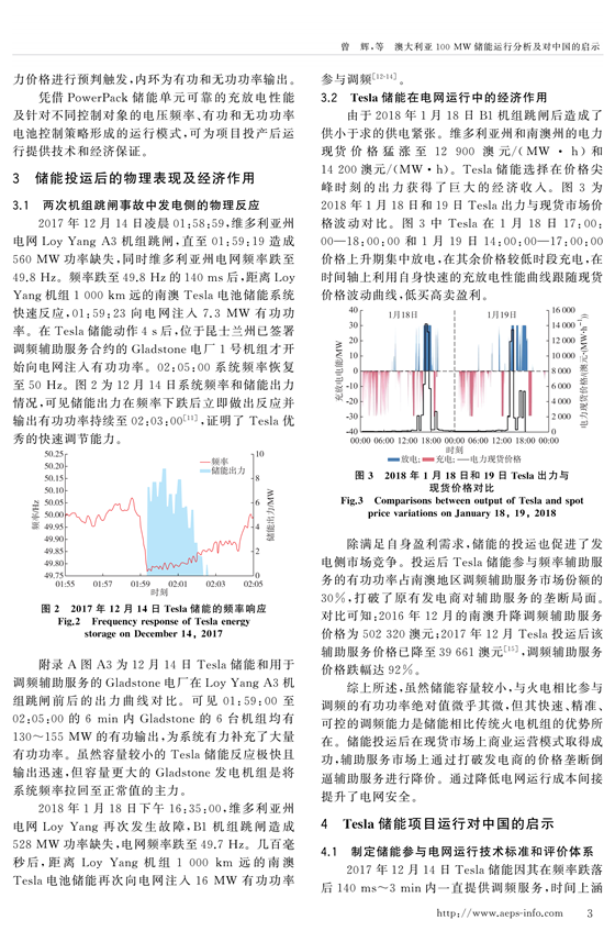 2017年12月1日,100 MW/129 MW·h 特斯拉鋰電池儲能電站在澳大利亞南澳州投運(yùn),并于2017年12月14日和2018年1月18日維多利亞州的LoyYang發(fā)電站機(jī)組跳閘事故中跨區(qū)參與電網(wǎng)調(diào)頻。首先,分析了特斯拉(Tesla)儲能電池投入澳大利亞電網(wǎng)運(yùn)行的物理和經(jīng)濟(jì)原因,介紹電池的結(jié)構(gòu)及控制策略,Tesla儲能投運(yùn)后的運(yùn)行狀況;然后,從制定中國儲能參與電網(wǎng)運(yùn)行技術(shù)標(biāo)準(zhǔn)和評價(jià)體系、發(fā)揮儲能部分替代火電機(jī)組一次調(diào)頻的能力、借鑒國外快速調(diào)頻輔助服務(wù)模式、探索儲能自盈利商業(yè)模式等角度深入探討Tesla儲能運(yùn)行對中國儲能技術(shù)及電網(wǎng)的啟示和借鑒意義。