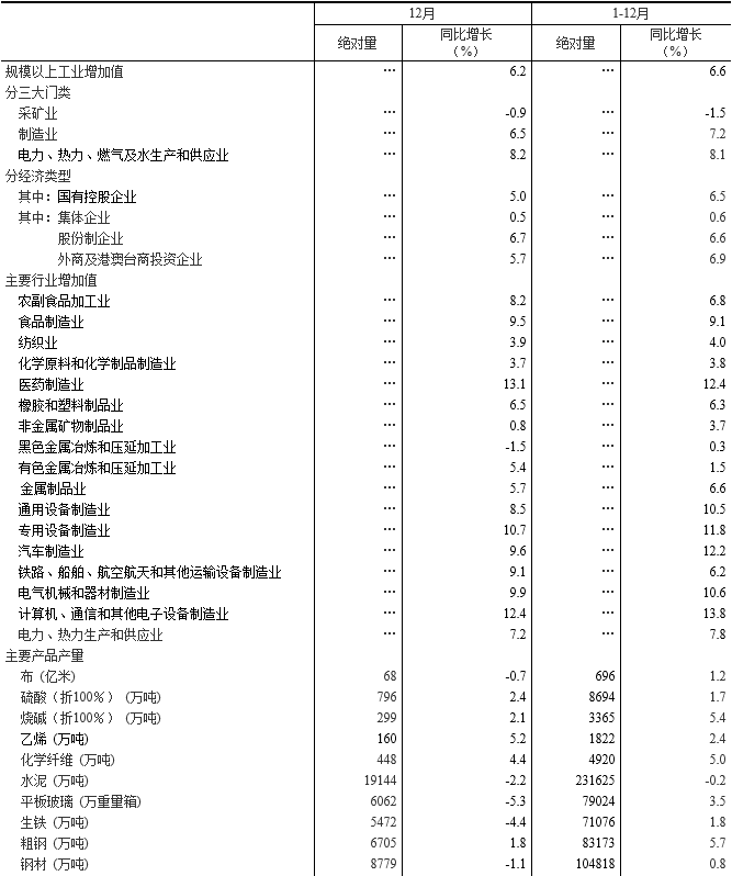 分行業(yè)看,12月份,41個大類行業(yè)中有35個行業(yè)增加值保持同比增長。其中,農(nóng)副食品加工業(yè)增長8.2%,紡織業(yè)增長3.9%,化學原料和化學制品制造業(yè)增長3.7%,非金屬礦物制品業(yè)增長0.8%,黑色金屬冶煉和壓延加工業(yè)下降1.5%,有色金屬冶煉和壓延加工業(yè)增長5.4%,通用設備制造業(yè)增長8.5%,專用設備制造業(yè)增長10.7%,汽車制造業(yè)增長9.6%,鐵路、船舶、航空航天和其他運輸設備制造業(yè)增長9.1%,電氣機械和器材制造業(yè)增長9.9%,計算機、通信和其他電子設備制造業(yè)增長12.4%,電力、熱力生產(chǎn)和供應業(yè)增長7.2%。