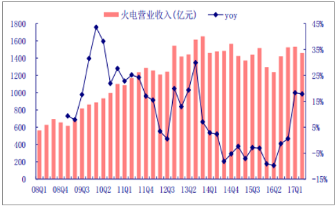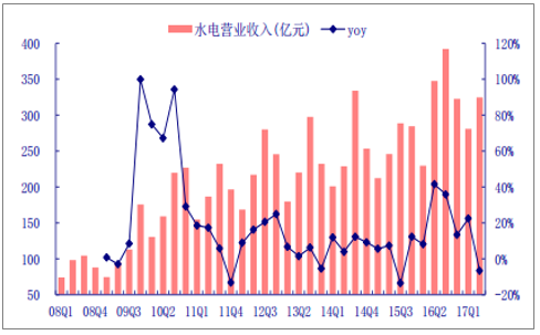 發(fā)電量增長助力收入提升。2017年1-6月,火電行業(yè)營業(yè)收入2989.1億元,同比增長18.1%;水電582.7億元,同比增長3.9%。二季度,火電實(shí)現(xiàn)營業(yè)收入1458.3億元,同比提升17.8%;水電324.5億元,同比下滑6.6%。