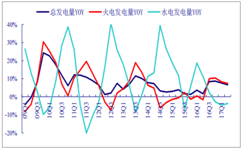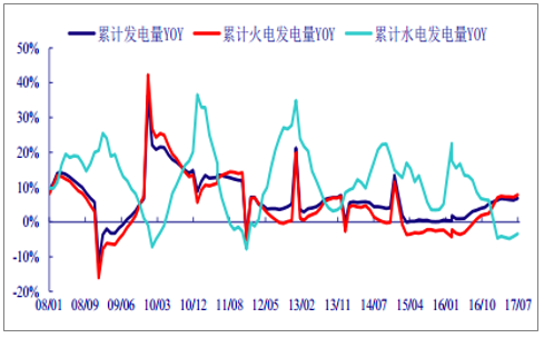 2017年上半年經(jīng)濟(jì)回暖推動(dòng)發(fā)電量平穩(wěn)增長。1-6月全國累計(jì)發(fā)電量29598億千瓦時(shí),同比增長6.3%,增速較去年同期提高5.3個(gè)百分點(diǎn)。其中,火電發(fā)電量22215億千瓦時(shí),同比增加7.1%,增速較去年同期提升10.2個(gè)百分點(diǎn);由于來水偏枯,水電發(fā)電量僅為4613億千瓦時(shí),同比下降4.2%。