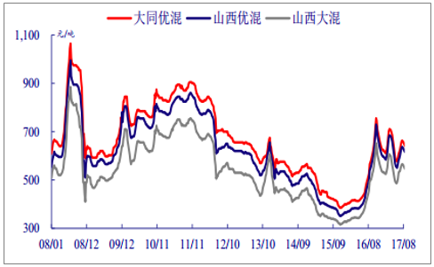 上半年動(dòng)力煤震蕩式小幅回調(diào)。2017年煤炭行業(yè)調(diào)控政策已經(jīng)由2016年的“去產(chǎn)能,限產(chǎn)量”逐漸調(diào)整為“保供應(yīng),穩(wěn)煤價(jià)”。進(jìn)入2017年,由于需求同比增速明顯提升,供給端增長也不明顯,煤價(jià)整體雖有下跌但仍維持高位。