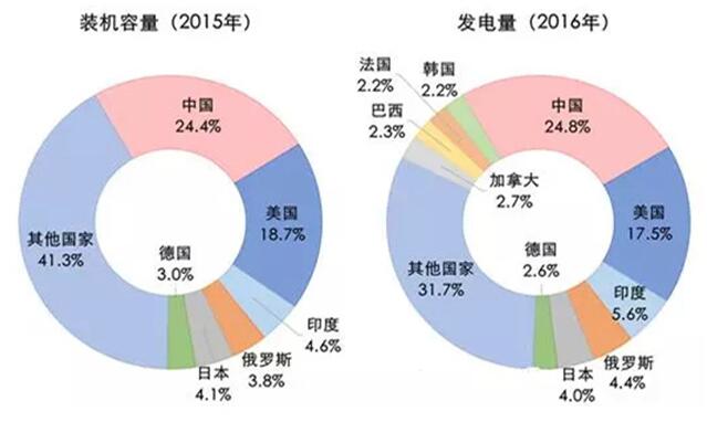 一是電力供應能力顯著增強。經(jīng)過多年努力,我國已經(jīng)完全扭轉了電力供應長期不足的局面。2016年底,中國電力裝機容量16.51億千瓦、發(fā)電量6.02萬億千瓦時,發(fā)電裝機容量、發(fā)電量和電網(wǎng)規(guī)模均居世界第一。電力供應能力總體較為充裕,除局部地區(qū)受電煤供應緊張、水庫來水偏枯等隨機性因素影響,出現(xiàn)個別時段電力供應偏緊外,全國電力供需總體平衡、個別省區(qū)略有富余。部分國家發(fā)電裝機容量(2015年)和發(fā)電量(2016年)占比情況見圖1。從圖中可以看出,中國發(fā)電裝機容量與發(fā)電量的占比均為約25%(2016年中國裝機容量又增加了1.2億千瓦)基本一致,說明了中國發(fā)電裝機的利用小時數(shù)與世界基本持平。