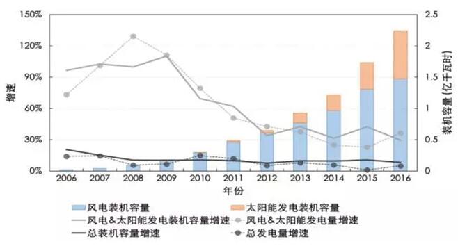 圖2  中國風電、太陽能發(fā)電裝機及發(fā)電量增速情況(數(shù)據(jù)來源:中電聯(lián))