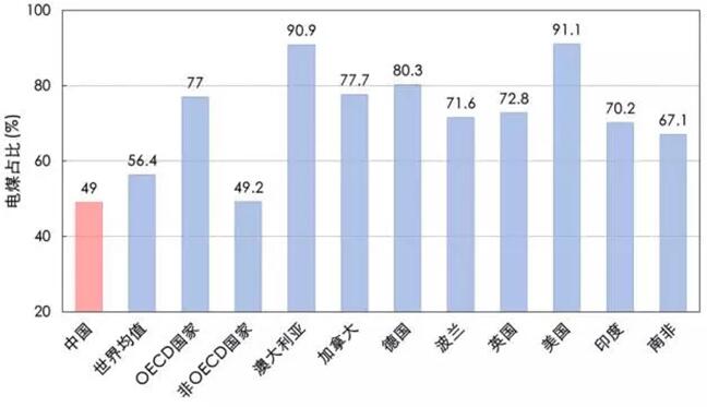 大力發(fā)展非化石能源,大力推進化石能源清潔高效利用,是邁向綠色低碳能源發(fā)展道路的兩個重要戰(zhàn)略途徑。我國煤炭資源相對豐富,約占一次能源消費總量的64%。以煤為主的資源稟賦,決定了我國能源向低碳化轉型任務的艱巨性和長期性。燃煤發(fā)電排放的常規(guī)污染物(煙塵、二氧化硫、氮氧化物)經(jīng)過嚴格治理,已不是制約電力轉型發(fā)展的關鍵因素。在我國以PM2.5為主要特征的霧霾型空氣污染仍然十分嚴重的情況下,要解決好約7億噸散燒煤污染空氣環(huán)境的問題,需要大力提高電煤在煤炭消費中的比重。我國電煤占煤炭消費比重多年來一直在50%左右,遠低于國外發(fā)達國家甚至是世界平均水平,如歐盟81.7%、德國85.7%、英國82.1%、美國92.8%(見圖5)。未來一個時期煤電仍將是我國的主體電源,要做好煤電發(fā)展規(guī)劃,發(fā)揮好煤電在系統(tǒng)中的作用。2010年時,煤電占全國總裝機的比重為71%、占總發(fā)電量的比重為78%;根據(jù)《電力發(fā)展“十三五”規(guī)劃》,到2020年,煤電裝機將達到11億千瓦,占全國總裝機的比重下降到約55%、發(fā)電量的比重下降到約62%。新能源發(fā)電出力波動性大,而我國調節(jié)能力好的水電站、抽水蓄能電站、燃氣電站等靈活調節(jié)電源比重低,系統(tǒng)調節(jié)主要依靠煤電機組,要加大實施煤電機組靈活性改造,進一步提高調解能力,更好地服務新能源發(fā)展。同時,要嚴格控制煤電發(fā)展增量,嚴格防止煤電的“碳鎖定”效應。根據(jù)中電聯(lián)分析,中國在役煤電機組平均運行年齡約為11年,這比美國平均運行年齡約為38年要小得多,長期碳減排壓力更大。