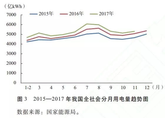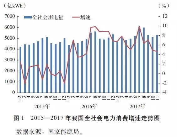 2017年,受經(jīng)濟增速回升、電能替代步伐加快、夏季氣溫偏高等因素影響,全社會用電量增速回升。2017年1~11月份全社會用電量5.73萬億kWh,同比增長6.5%,比2016年同期提高1.5個百分點。