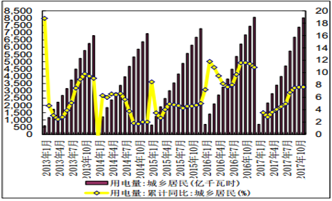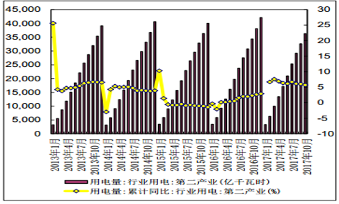 2017年1-11 月份,全國全社會用電量 57331 億千瓦時,同比增長 6.5%,增速比上年同期提高 1.5 個百分點。1-11 月份,第一產(chǎn)業(yè)用電量 1074 億千瓦時,同比增長 7.1%,占全社會用電量的比重為 1.9%;第二產(chǎn)業(yè)用電量 40185 億千瓦時,同比增長 5.5%,增速比上年同期提高 2.9 個百分點,占全社會用電量的比重為 70.1%,對全社會用電量增長的貢獻率為 59.8%;第三產(chǎn)業(yè)用電量 8054 億千瓦時,同比增長 10.5%,增速比上年同期回落1.1 個百分點,占全社會用電量的比重為 14.0%,對全社會用電量增長的貢獻率為 21.9%;城鄉(xiāng)居民生活用電量 8018 億千瓦時,同比增長 7.7%,增速比上年同期回落 3.8 個百分點,占全社會用電量的比重為 14.0%,對全社會用電量增長的貢獻率為 16.3%。