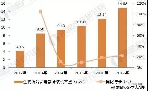 圖表4:2012-2017年生物質(zhì)能發(fā)電累計裝機容量(單位:GW,%)