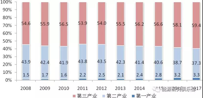 圖1-3 2008~2017年三次產(chǎn)業(yè)增加值占國(guó)內(nèi)生產(chǎn)總值比重(單位:%)