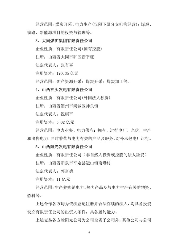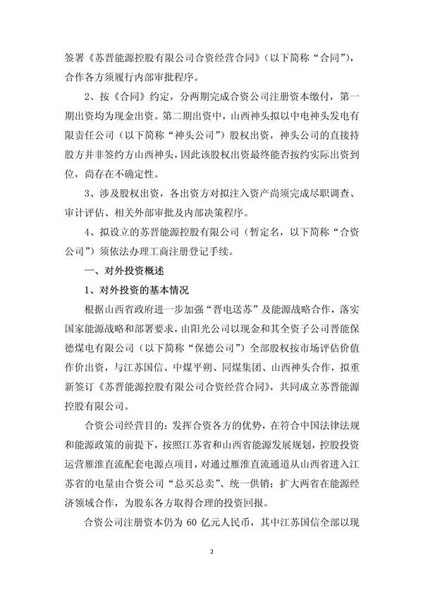 由陽(yáng)光公司以現(xiàn)金和其全資子公司晉能保德煤電有限公司(以下簡(jiǎn)稱“保德公司”)全部股權(quán)按市場(chǎng)評(píng)估價(jià)值作價(jià)出資,與江蘇國(guó)信、中煤平朔、同煤集團(tuán)、山西神頭合作,擬重新簽訂《蘇晉能源控股有限公司合資經(jīng)營(yíng)合同》,共同成立蘇晉能源控股有限公司。