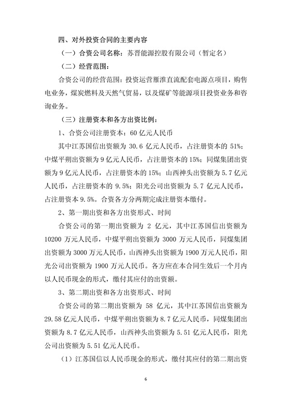 合資公司注冊(cè)資本仍為 60 億元人民幣,其中江蘇國(guó)信全部以現(xiàn) 3 金出資 30.6 億元人民幣,占注冊(cè)資本 51%;中煤平朔出資額為 9 億元人民幣,占注冊(cè)資本的 15%;同煤集團(tuán)出資額為 9 億元人民幣,占注冊(cè)資本的 15%;山西神頭出資額為 5.7 億元人民幣,占注冊(cè)資本的 9.5%;陽(yáng)光公司出資額為 5.7 億元人民幣,占注冊(cè)資本 9.5%。