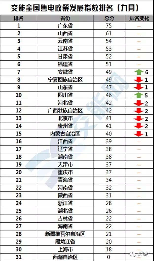 九月交能網(wǎng)繼續(xù)更新售電政策發(fā)展指數(shù)。八月全國多地電力價格持續(xù)進(jìn)行第四輪下調(diào),電改紅利持續(xù)釋放!政策方面,2018年8月,廣東發(fā)布了我國歷史上第一個電力現(xiàn)貨市場規(guī)則。同時,安徽和四川兩省在政策環(huán)境上也突飛猛進(jìn)!目前政策發(fā)展指數(shù)仍由廣東省、山西省、云南省、江蘇省和甘
