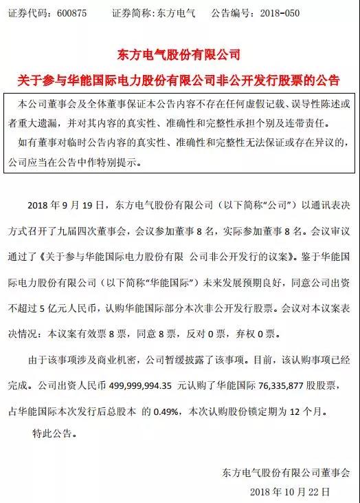 聚焦|東方電氣:約5億元認(rèn)購華能國際7633萬股股票