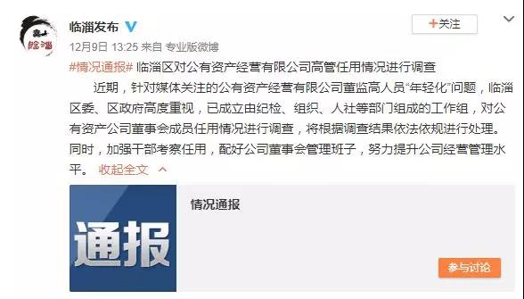 12月9日,山東省淄博市臨淄區(qū)委宣傳部官方微博發(fā)布了題為《臨淄區(qū)對公有資產(chǎn)經(jīng)營有限公司高管任用情況進行調(diào)查》的消息。