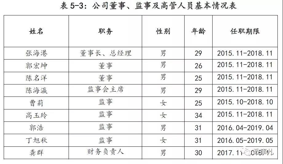 在該公司董事會成員中,董事長張海港為“85后”,上任時27歲,兩名董事郭宏坤、陳名洋分別在24歲、23歲出任該職務(wù)。此外,該公司共有61名員工,年齡全部為35周歲以下。