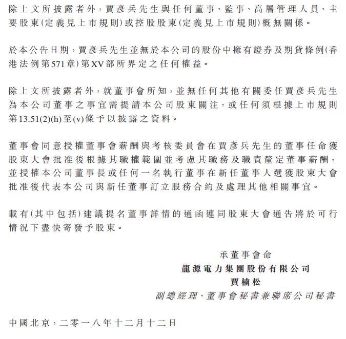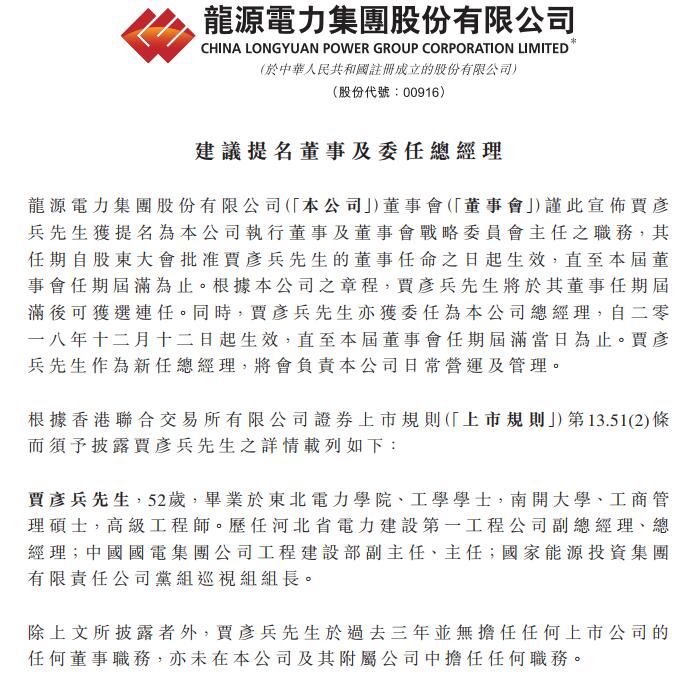 龍?jiān)措娏Πl(fā)布公告稱,提名賈彥兵為執(zhí)行董事及董事會戰(zhàn)略委員會主任 ,任期自股東大會批準(zhǔn)其董事任命之日起生效,直至本屆董事會任期屆滿為止。