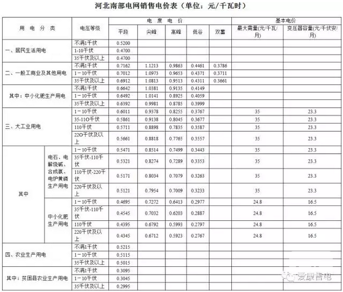 河北南部電網(wǎng)銷(xiāo)售電價(jià)表
