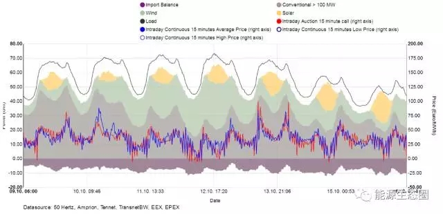 (2017年第41周德國電力供需和現(xiàn)貨價(jià)格曲線)