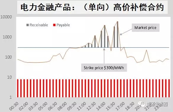 在實(shí)時(shí)電價(jià)在電力市場競爭中形成的情形下,可能出現(xiàn)高價(jià)的幅度、頻度以及持續(xù)時(shí)間都有極大不確定性,特別是受天氣影響很大。調(diào)峰電廠的收入很大程度上是未知的。另一方面,實(shí)時(shí)電力價(jià)格攀高對(duì)零售電商的購電成本造成上升壓力。如上圖所示,調(diào)峰電廠與零售電商協(xié)商交易一個(gè)單向差價(jià)合同。這個(gè)合同有一個(gè)很高的啟動(dòng)價(jià)格每兆瓦小時(shí)300澳元。只有當(dāng)實(shí)時(shí)電力價(jià)格超過啟動(dòng)價(jià)格時(shí),調(diào)峰電廠需為零售電商補(bǔ)償差價(jià),即超過300澳元的灰色柱狀部分。為了獲得差價(jià)補(bǔ)償,零售電商需付給調(diào)峰電廠一定的“保險(xiǎn)金”。圖中底部每兆瓦小時(shí)8澳元的紅色柱狀就是無論實(shí)時(shí)電價(jià)是否高于合同啟動(dòng)價(jià)格零售電商每個(gè)小時(shí)的應(yīng)付款。在實(shí)時(shí)電力市場沒有單設(shè)容量市場的情形下,這樣交易就實(shí)現(xiàn)了容量價(jià)值。不過這是在電力金融市場實(shí)現(xiàn)的。電力金融市場單向差價(jià)合同的價(jià)格便是調(diào)節(jié)調(diào)峰電廠的市場價(jià)值。如果兩三年實(shí)時(shí)電力市場也不出現(xiàn)高價(jià),那么零售電商對(duì)單向差價(jià)合同需求不旺,容量的價(jià)格會(huì)走低,反之亦然。