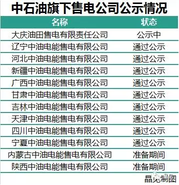 全國工商系統顯示,大慶油田售電有限責任公司旗下有11家中油電能售電公司。分別為遼寧、河北、新疆、廣西、甘肅、吉林、天津、四川、寧夏、內蒙古、陜西中油電能售電有限公司;已經有9家售電公司在交易中心通過了公示,其中天津、河北中油電能售電在北京交易中心公示。