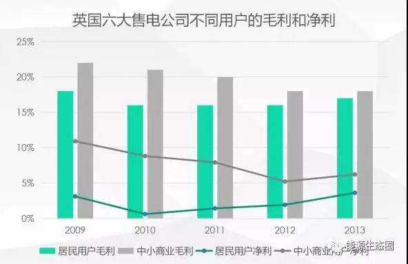3%-5%是一個(gè)平均凈利潤(rùn)率,但對(duì)于每一家公司來(lái)說(shuō)利潤(rùn)是不一樣的。從英國(guó)的六家售電公司的統(tǒng)計(jì)看,居民用戶的毛利率低于中小商業(yè)的毛利率,原因在于,用在居民用戶身上的成本幾乎等于一戶中小商業(yè)的營(yíng)銷成本,但是居民用戶的電量比較低,所以營(yíng)業(yè)額也會(huì)比較低。另外一方面,非常大的工業(yè)用戶其溢價(jià)能力很高,所以大工業(yè)用戶的利潤(rùn)也比較薄。