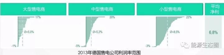上圖是2013年德國(guó)售電公司的利潤(rùn)率范圍,可以看到售電公司從虧損到非常賺的(凈利潤(rùn)在22%)都有。從圖中可以發(fā)現(xiàn):