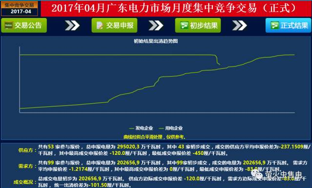 共有53 家參與報(bào)價(jià), 總申報(bào)電量為 295020,3 萬(wàn)千瓦時(shí), 其中 43 家初步成交,成交的供應(yīng)方平均申報(bào)價(jià)差為-237.1509厘/千瓦時(shí), 其中最高成交申報(bào)價(jià)差 -120.0厘/千瓦時(shí),最低成交申報(bào)價(jià)差 -450厘/千瓦時(shí)。