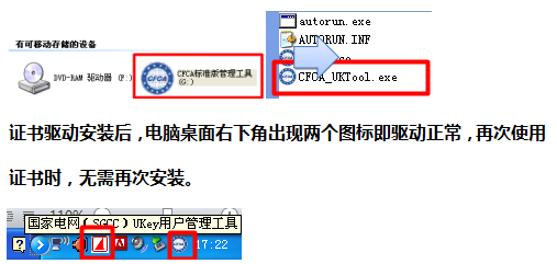 6. 數(shù)字證書驅(qū)動安裝檢查。首次插入證書時,如自動彈出安裝指引,請按指引進行安裝,如無自動安裝,請打開我的電腦找到數(shù)字證書盤符,點擊右鍵‘打開’,進入后手動安裝CFCA_UKTool.exe