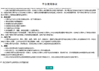 打開注冊須知后,需完整閱讀平臺使用協(xié)議后,勾選“我已閱讀注冊須知并同意條款”,并點擊下一步。