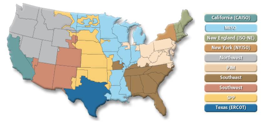 美國10個(gè)電力批發(fā)市場示意圖