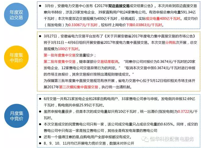 2017年年初至今,安徽共開展了一次年度雙邊協(xié)商交易,一次年度集中競價(jià)交易(分兩批),以及六次月度集中競價(jià)交易。