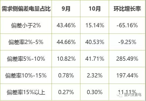 10月市場(chǎng)電量偏差率控制情況遠(yuǎn)不如上月。偏差率小于2%的用電量占比環(huán)比降幅65%。9月份偏差率低于5%的電量占全市場(chǎng)電量的88%,而10月份,這一數(shù)據(jù)僅為55%。