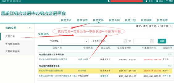 二是在“我的交易”界面中查看“交易公告”:
