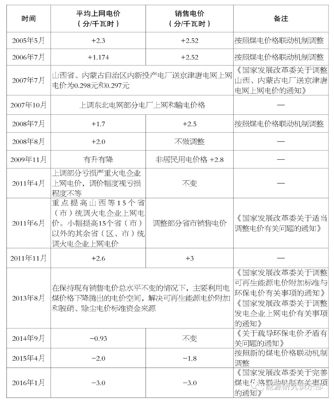 2005年以來電價(jià)調(diào)整情況