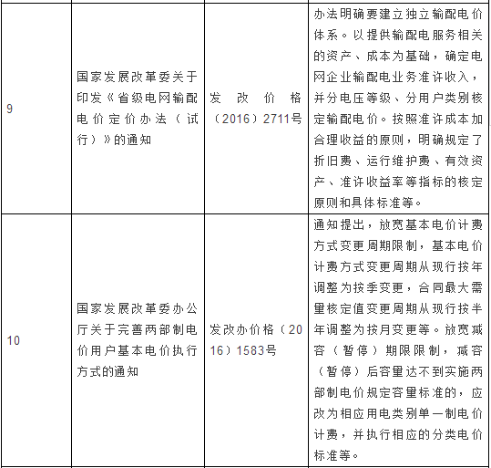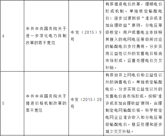 1.輸配電價改革正按照“管住中間、放開兩頭”的電價改革總體思路不斷深化。《國務(wù)院辦公廳關(guān)于印發(fā)電價改革方案的通知》(國辦發(fā)〔2003〕62號)明確規(guī)定了輸配電價改革的原則和方向,給后續(xù)政策制定奠定了堅(jiān)實(shí)基礎(chǔ)。《中共中央國務(wù)院關(guān)于進(jìn)一步深化電力體制改革的若干意見》(中發(fā)〔2015〕9號)進(jìn)一步將電價改革作為首要任務(wù),明確提出單獨(dú)核定輸配電價,按“準(zhǔn)許成本加合理收益”原則,分電壓等級核定等要求。