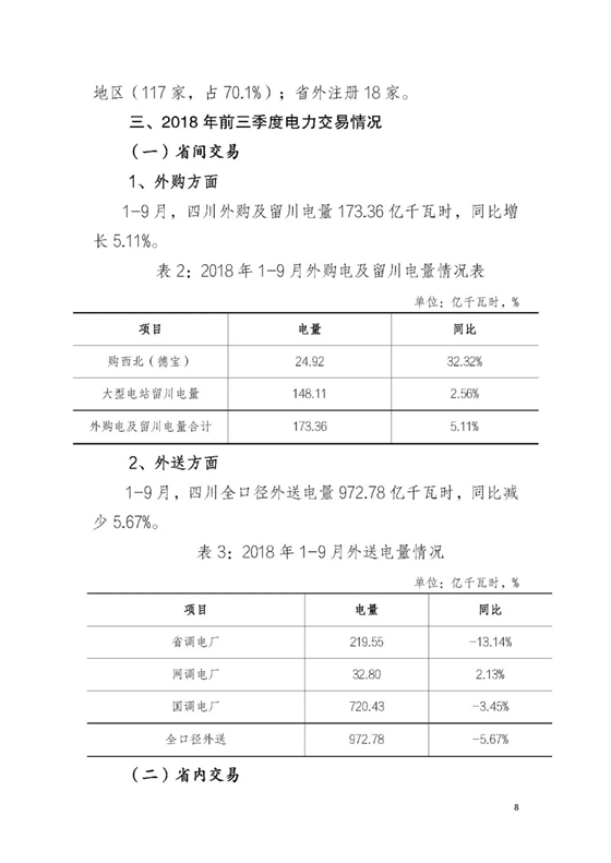 (一)省間交易:外購方面:四川外購電量173.36億千瓦時,同比增長5.11%。外送方面:四川全口經外送電量972.78億千瓦時,同比下降5.67%。