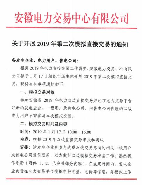 安徽電力交易中心日前發(fā)布了《關(guān)于開展2019年第二次模擬直接交易的通知》,安徽電力交易中心有限公司擬組織市場主體開展2019年第二次模擬直接交易