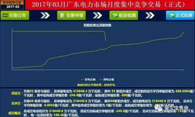 結(jié)果:供應(yīng)方:共有52家參與報價,總申報電量為415649 4萬千瓦時,其中33家初步成交,成交的供應(yīng)方平均申報價差為-368 0594厘 千瓦時,其中最高成交申報價差-245 9厘 千瓦時,最低成交申報價差-500厘 千瓦時。需