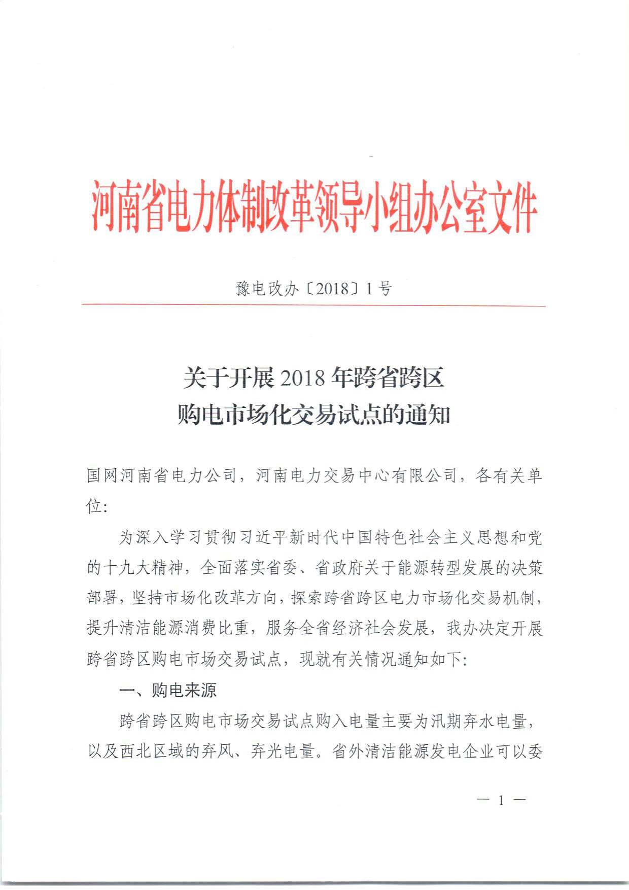 河南省電力體制改革領(lǐng)導(dǎo)小組日前發(fā)布了《關(guān)于開展2018年跨省跨區(qū)購電市場化交易試點(diǎn)的通知》,通知中稱,2018年河南省跨省跨區(qū)購電市場化交