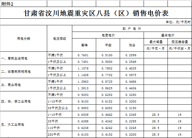 對省內(nèi)一般工商業(yè)用電(除汶川地震重災(zāi)八縣區(qū)非居民照明、非普工業(yè)用電)價格,在現(xiàn)行標準基礎(chǔ)上每千瓦時統(tǒng)一降低1.74分錢;汶川地震重災(zāi)八縣區(qū)商業(yè)用電價格,在現(xiàn)行標準基礎(chǔ)上每千瓦時統(tǒng)一降低4.77分錢。調(diào)整后的銷售電價表詳見附件1、2。