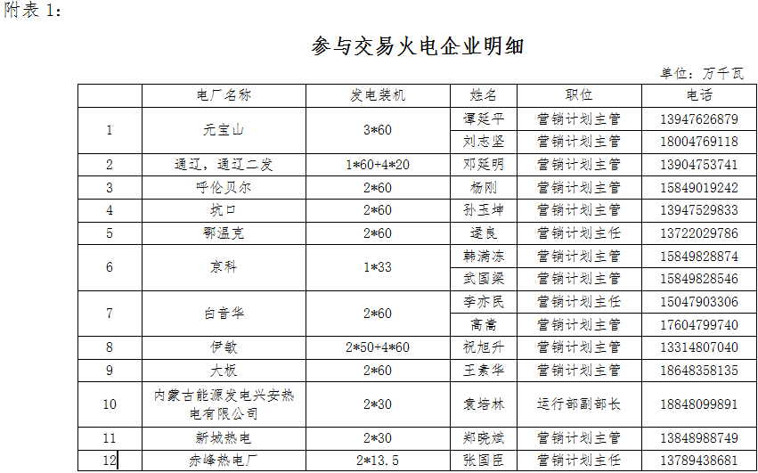 一、售電方:蒙東地區(qū)符合有關(guān)文件規(guī)定的火電企業(yè),名單詳見附表1。