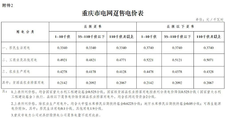 本次電價調(diào)整執(zhí)行范圍為國網(wǎng)重慶市電力公司供電區(qū)域,三峽水利電力(集團)股份有限公司同步執(zhí)行國網(wǎng)重慶市電力公司銷售電價。