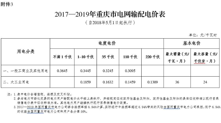 二、降低國網(wǎng)重慶市電力公司一般工商業(yè)及其他用電輸配電價每千瓦時0.0174元(見附表3)。
