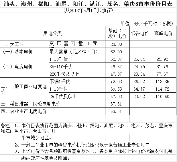 一、全省除深圳市外一般工商業(yè)電度電價每千瓦時統(tǒng)一降低0.58分(含稅,下同);深圳市的一般工商業(yè)電價和大工業(yè)電價已合并為工商業(yè)及其他電價,其各類工商業(yè)及其他電價均每千瓦時統(tǒng)一降低0.12分。各地各用戶調(diào)價后的具體電價標準見附件。