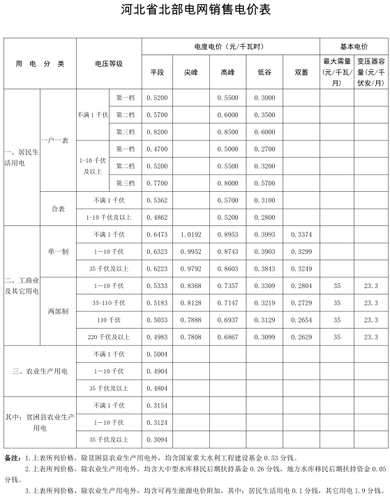 2.河北省北部電網(wǎng)銷售電價(jià)表