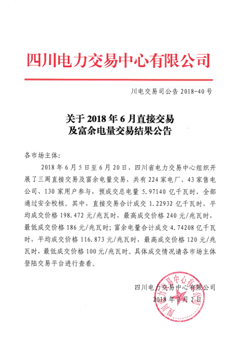 四川2018年6月直接交易成交1.22932億千瓦時 富余電量成交4.74208億千瓦時