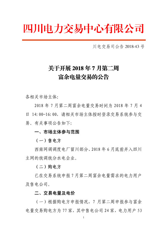 四川電力交易中心日前發(fā)布了《關(guān)于開展2018年7月第二周富余電量交易的公告》,交易采用復(fù)式競價(jià)撮合交易方式,交易過程分為集中競價(jià)、雙掛