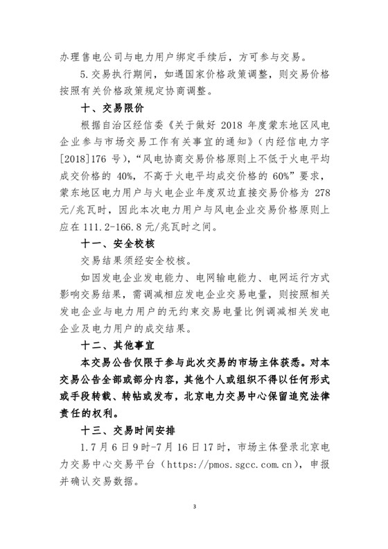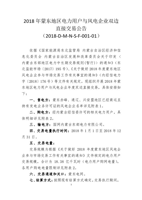 北京電力交易中心發(fā)布了《2018年蒙東地區(qū)電力用戶與風(fēng)電企業(yè)雙邊直接交易公告》,7月6日-7月16日組織開展2018年電力用戶與風(fēng)電企業(yè)年度雙邊